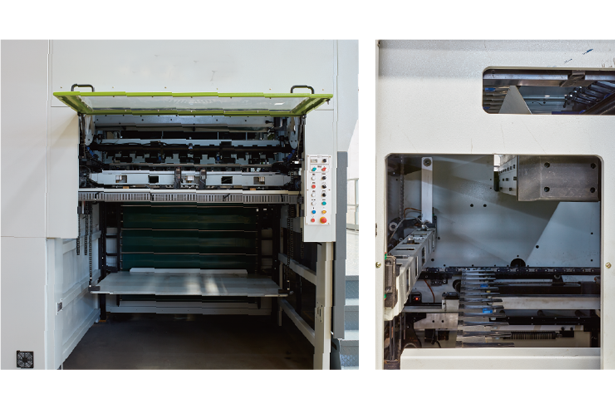 - 不停式气缸自动收纸插架及自动升降托架收纸台配合交替使用,可计数堆叠,同时配合皮带输送至机外(可与自动分纸机联接)
